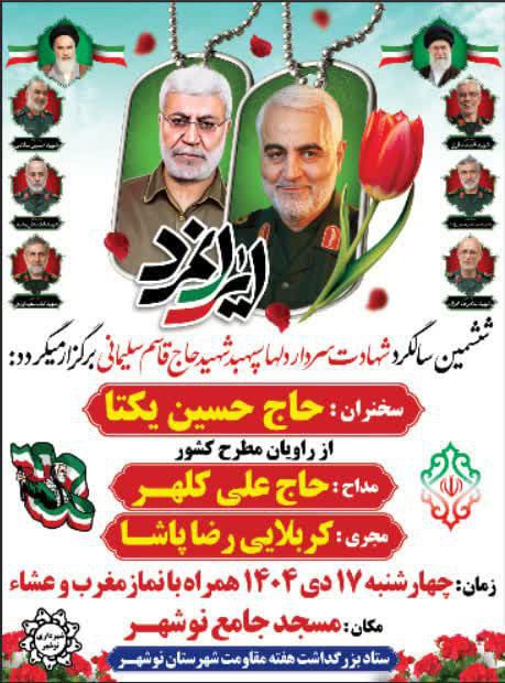 به گزارش پایگاه خبری تحلیلی نوشهر فردا به نقل از «بلاغ مازندران » مراسم گرامیداشت سرداران شهید مقاومت و سپهبد شهید حاج قاسم سلیمانی با حضور اقشار مختلف مردم، خانوادههای شهدا و جمعی از مسئولان، در شهرستان نوشهر برگزار میشود.